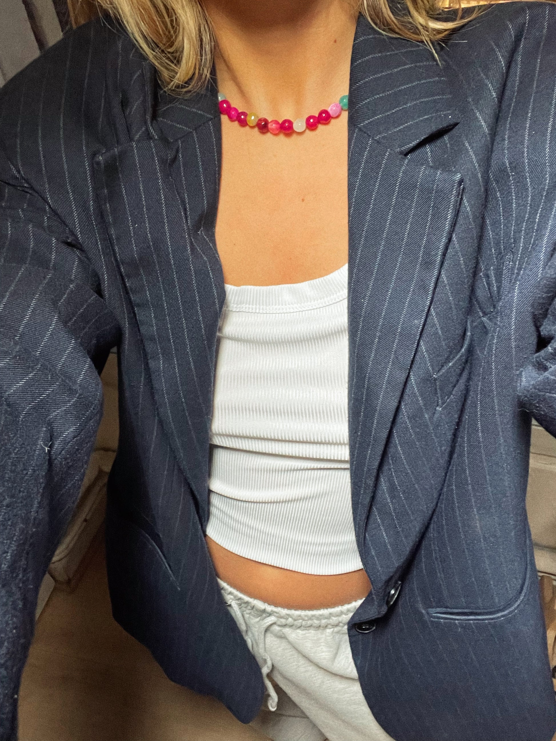 Smoothie, c’est le cocktail vitaminé de la collection : des perles en agate multicolores facettées qui captent la lumière à chaque mouvement, relevées par une perle dorée façon strass qui joue la cerise sur le milkshake.